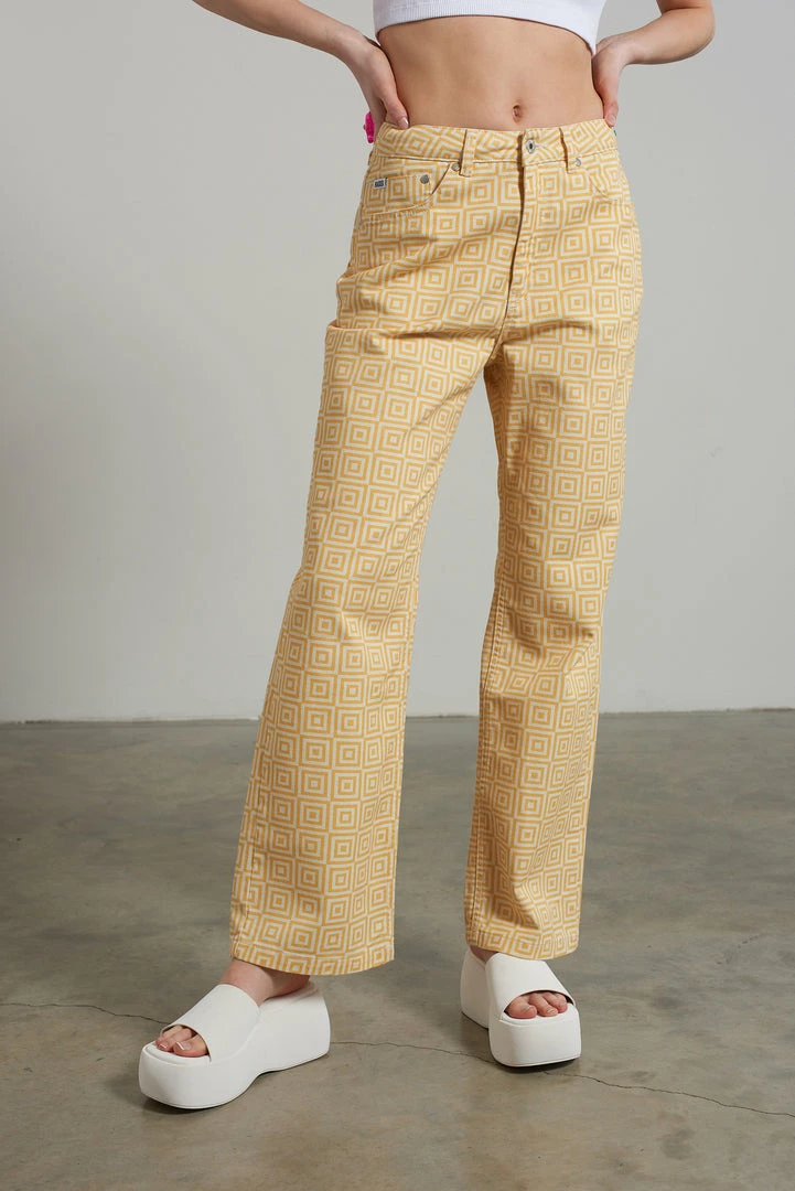 Ragged Jeans yellow and cream square print denim dad jeans.