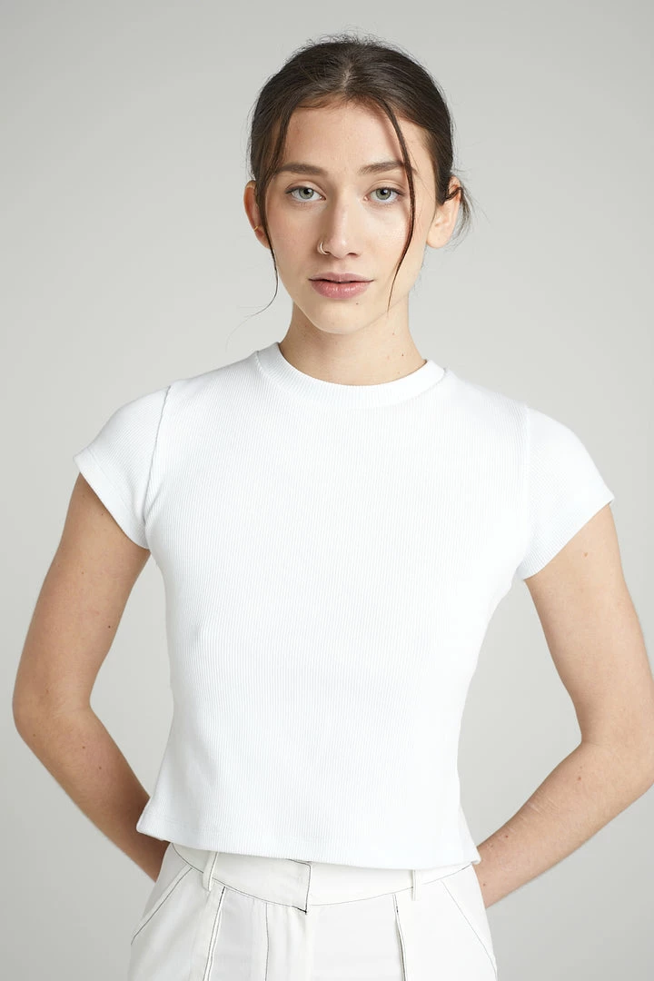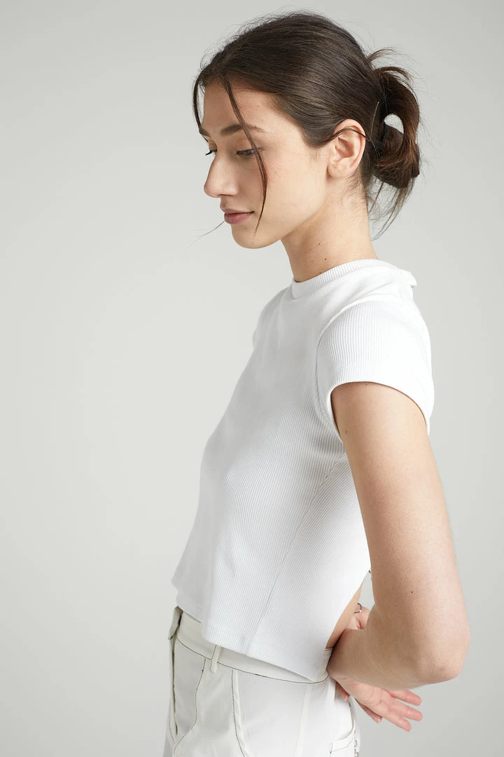 The Ragged Priest white ribbed ringer top with open back and lace up chain detail.