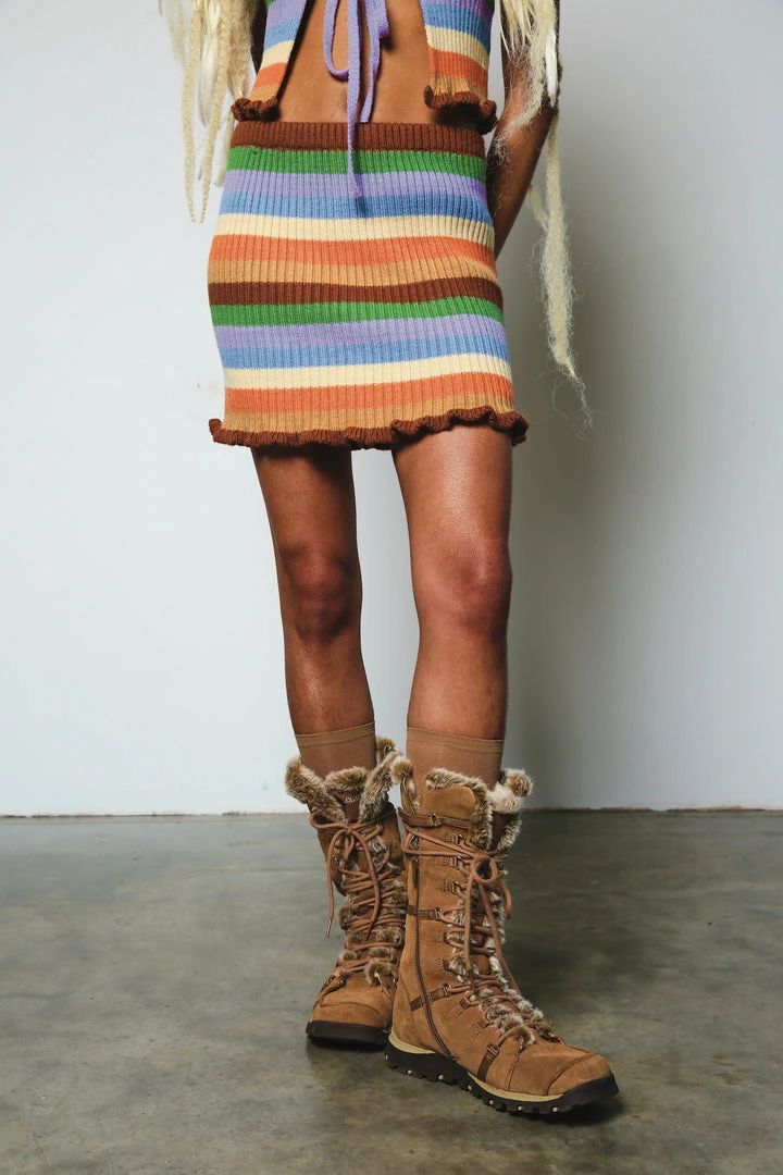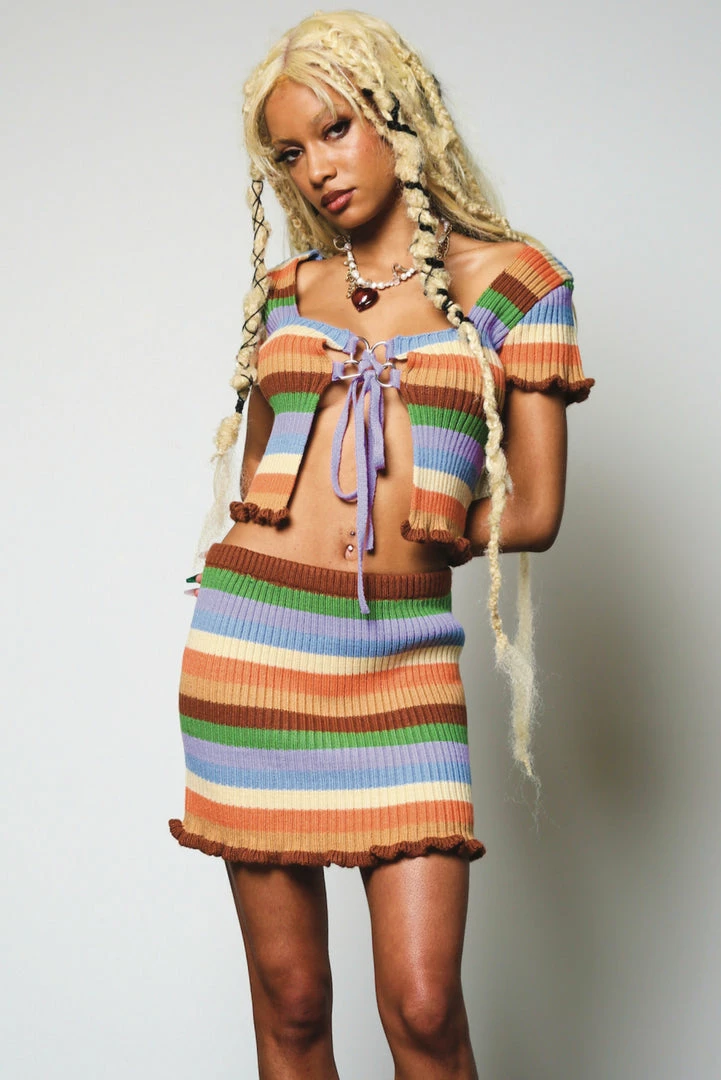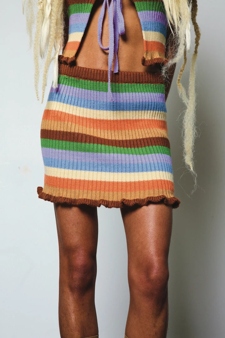 The Ragged Priest multi coloured striped chunky knitted mini skirt with frill bottom detail.