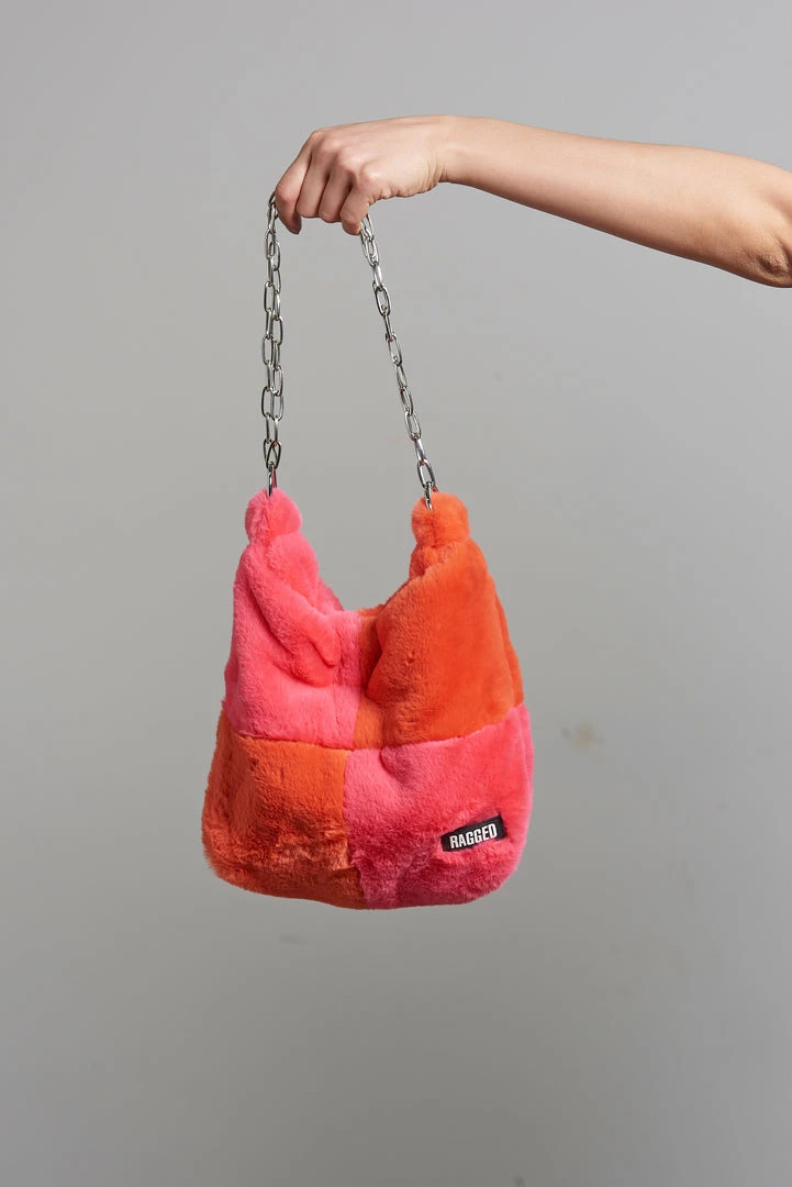 The Ragged Priest pink & red faux fur bag with chain strap.