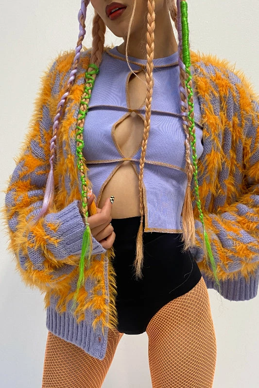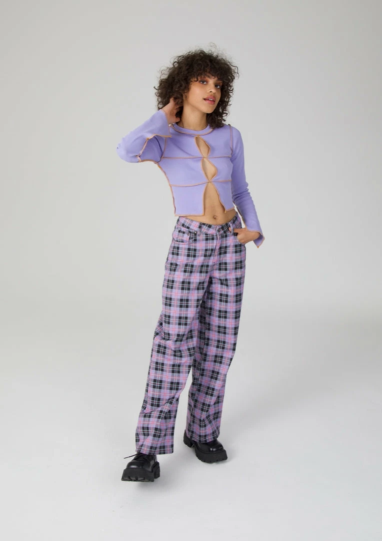 The Ragged Priest lilac long sleeve ribbed top with contrast overlock detail.