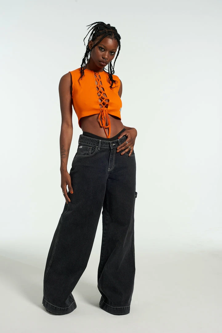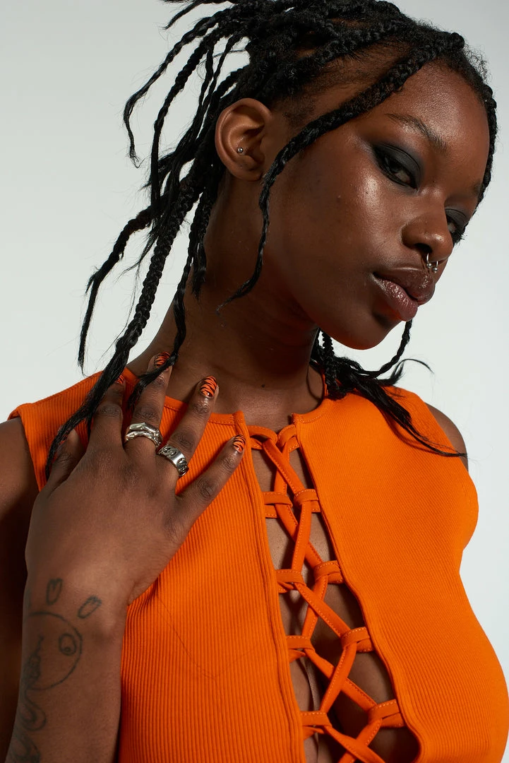 The Ragged Priest Orange crop top with cut out front and lace up detailing with tie finish.
