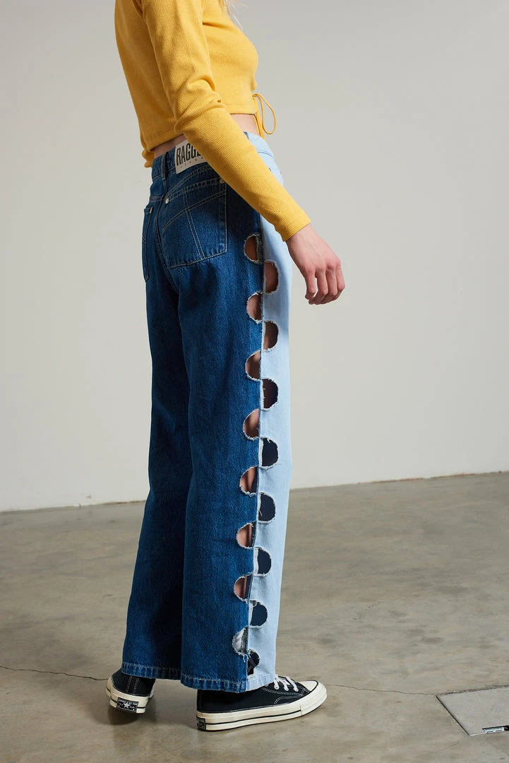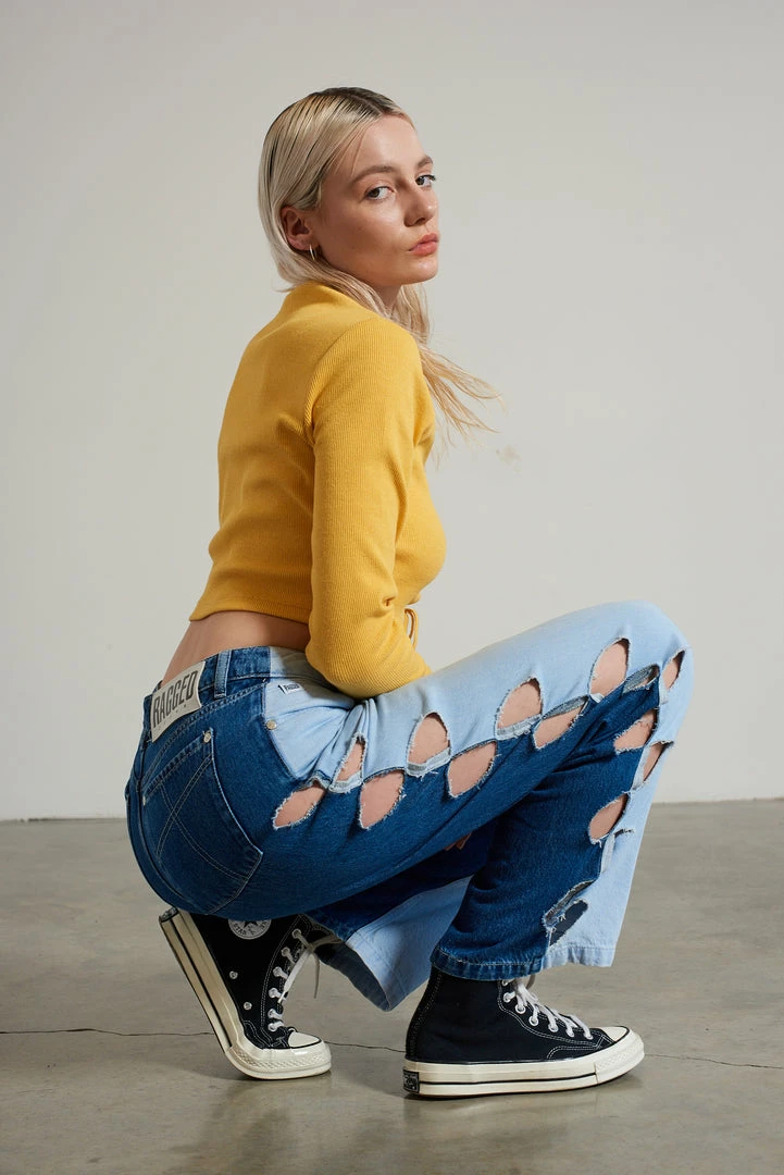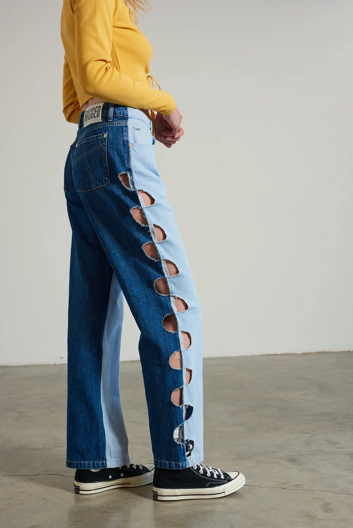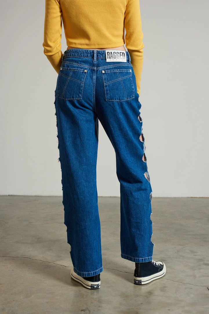 Ragged Jeans blue denim half and half dad jean with cut out side seam detail.